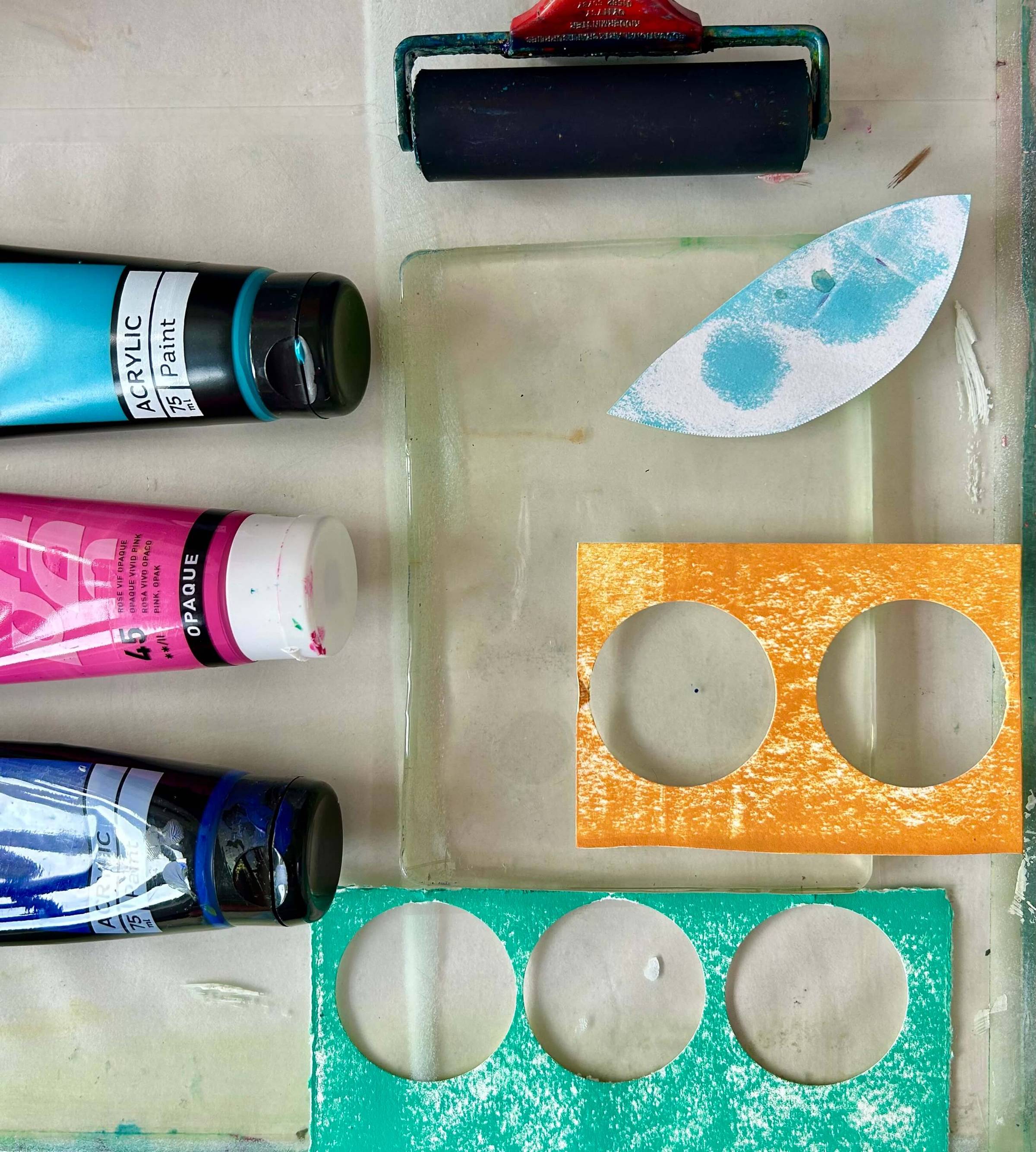 2 hours exploring colour pattern and layering using paints and a gelli plate. No experience needed!